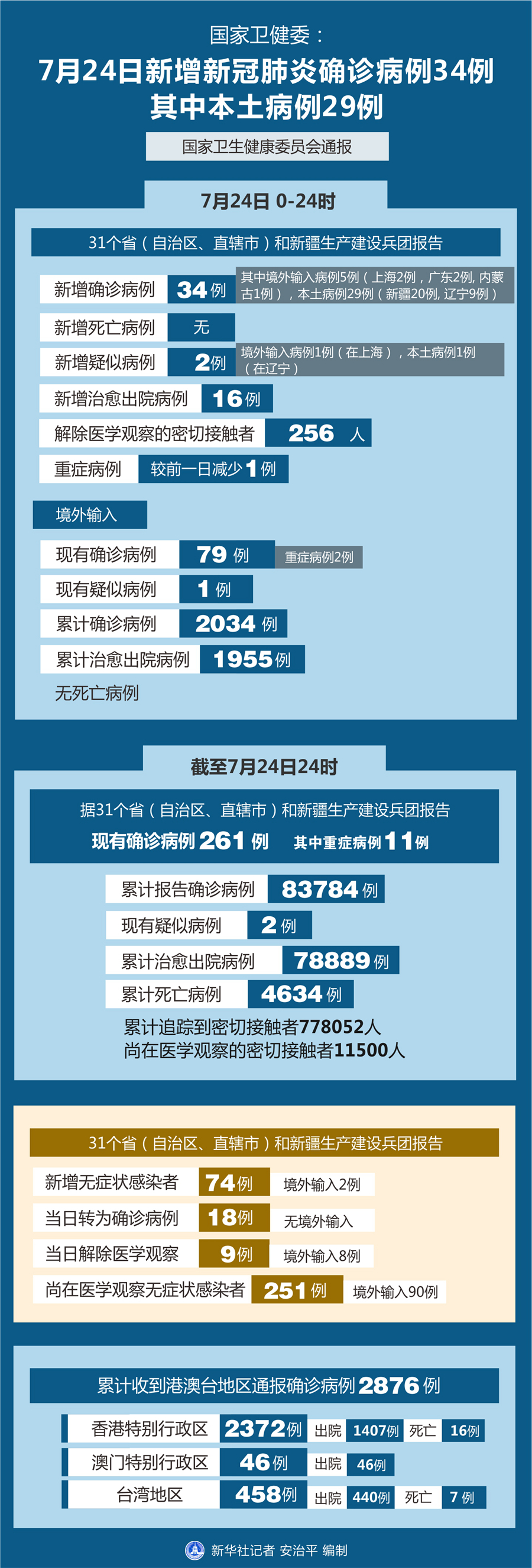 截至7月24日24時,據(jù)31個省(自治區(qū)、直轄市)和新疆生產(chǎn)建設(shè)兵團報告,現(xiàn)有確診病例261例(其中重癥病例11例),累計治愈出院病例78889例,累計死亡病例4634例,累計報告確診病例83784例,現(xiàn)有疑似病例2例。累計追蹤到密切接觸者778052人,尚在醫(yī)學觀察的密切接觸者11500人。