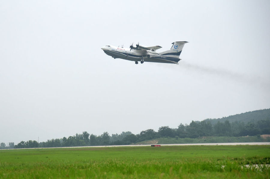 7月26日,水陸兩棲飛機(jī)AG600在日照山字河機(jī)場起飛。新華社記者 王凱 攝