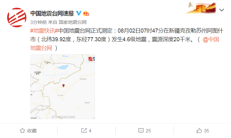 中國地震臺網(wǎng)正式測定:08月02日07時47分在新疆克孜勒蘇州阿圖什市(北緯39.92度,東經(jīng)77.30度)發(fā)生4.6級地震,震源深度20千米。