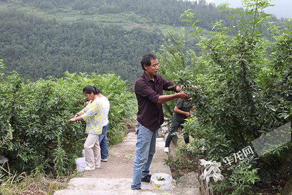 村民在劉瑞發(fā)(右一)的花椒地里采花椒。馬媛攝 華龍網發(fā)