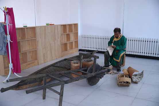 在獵民村手工藝工坊記者見(jiàn)到年輕時(shí)打過(guò)獵、扎過(guò)撮羅子(狩獵和游牧民族的一種圓錐形“房子”)的那春林,他正在用樺樹(shù)皮制作蟈蟈籠子。鄂溫克人會(huì)在籠子里放上蟈蟈,把蟈蟈當(dāng)作魚(yú)餌帶到阿倫河釣細(xì)鱗魚(yú)。他身旁的樺樹(shù)皮船、儲(chǔ)物筒、刀具配件都是用樺樹(shù)皮制作的。那春林說(shuō)今年已接到一批展品訂單,預(yù)計(jì)可以收入4萬(wàn)塊錢(qián),家里流轉(zhuǎn)的土地還可以為他帶來(lái)3萬(wàn)多元收入。