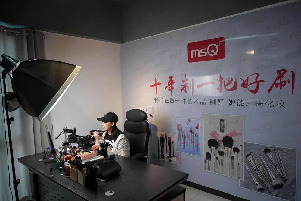 5月15日,在江西省南昌市青山湖區(qū)一家電商企業(yè)的直播間內,主播線上直播銷售化妝刷。新華社記者 彭昭之 攝