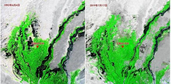 總面積0.66平方千米的艾勒恰克村地處沙漠邊緣,從遙感衛(wèi)星上可以看出自上個世紀90年代至今,沙漠邊緣地帶發(fā)生的一些變化。沙退了,綠色多了,農(nóng)村公路網(wǎng)織密起來。