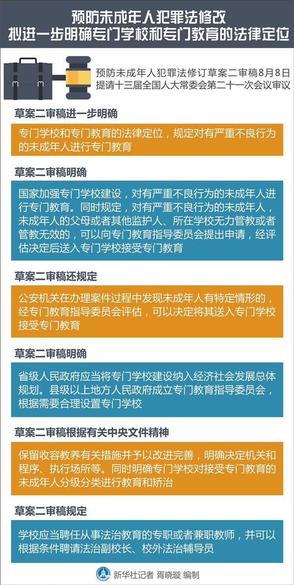 據(jù)了解,為貫徹落實(shí)有關(guān)中央文件精神,加強(qiáng)專門學(xué)校建設(shè)和專門教育工作,草案二審稿明確,國家加強(qiáng)專門學(xué)校建設(shè),對(duì)有嚴(yán)重不良行為的未成年人進(jìn)行專門教育。同時(shí)規(guī)定,對(duì)有嚴(yán)重不良行為的未成年人,未成年人的父母或者其他監(jiān)護(hù)人、所在學(xué)校無力管教或者管教無效的,可以向?qū)iT教育指導(dǎo)委員會(huì)提出申請(qǐng),經(jīng)評(píng)估決定后送入專門學(xué)校接受專門教育。