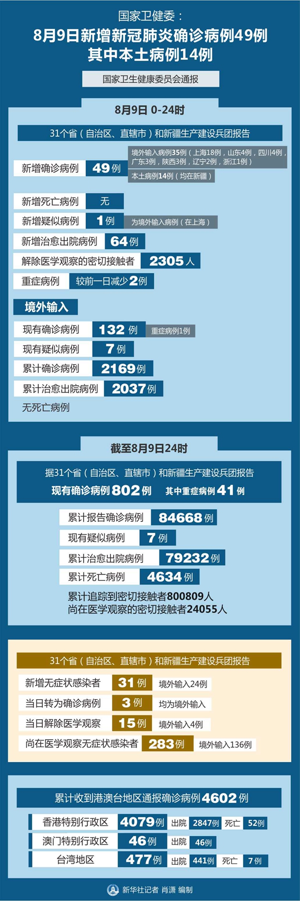 新華社北京8月10日電 國家衛(wèi)生健康委員會10日通報,8月9日0-24時,31個省(自治區(qū)、直轄市)和新疆生產建設兵團報告新增新冠肺炎確診病例49例,其中境外輸入病例35例(上海18例,山東4例,四川4例,廣東3例,陜西3例,遼寧2例,浙江1例),本土病例14例(均在新疆);無新增死亡病例;新增疑似病例1例,為境外輸入病例(在上海)。