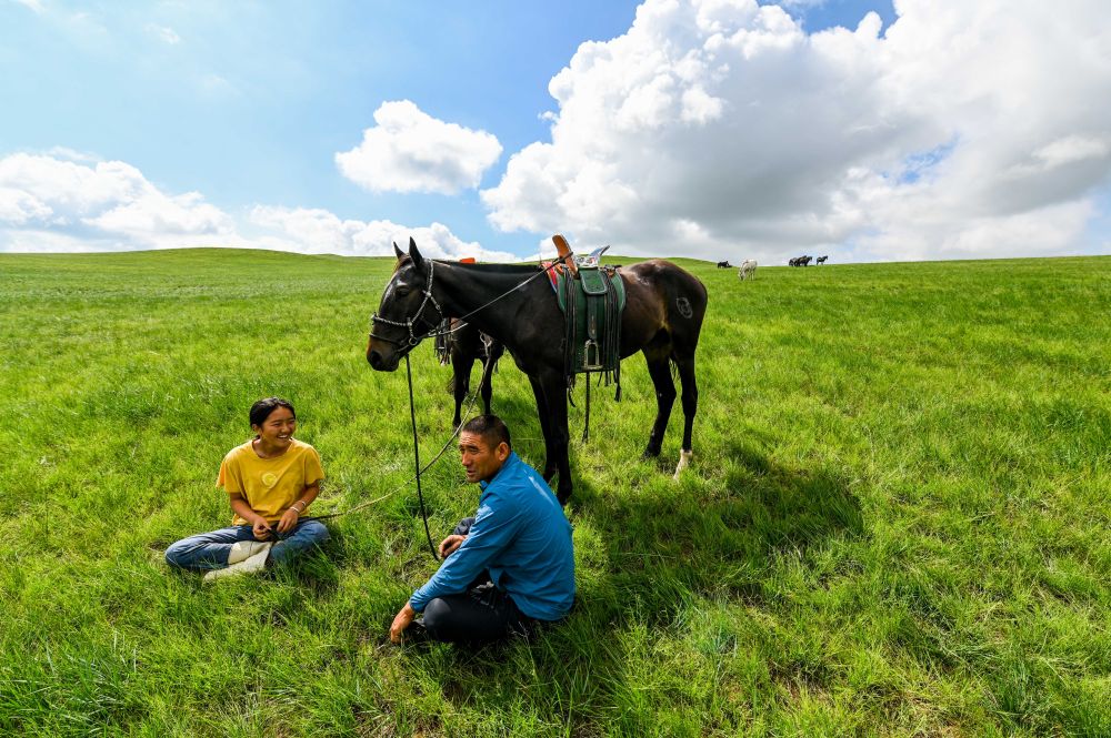 8月3日,錫林花(中)在草地上與小伙伴包音圖(右)聊天。