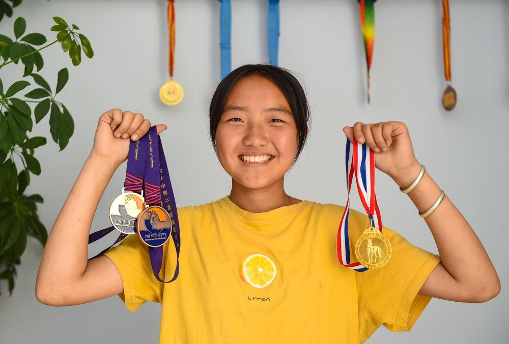 8月4日,錫林花在家中展示自己過去獲得的賽馬、射箭比賽獎牌。