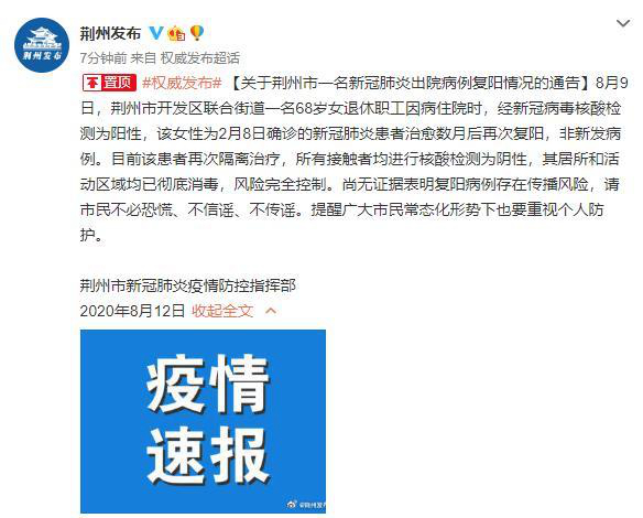 據(jù)湖北省荊州市新冠肺炎疫情防控指揮部12日通報(bào),8月9日,荊州市開發(fā)區(qū)聯(lián)合街道一名68歲女退休職工因病住院時(shí),經(jīng)新冠病毒核酸檢測為陽性,該女性為2月8日確診的新冠肺炎患者治愈數(shù)月后再次復(fù)陽,非新發(fā)病例。目前該患者再次隔離治療,所有接觸者均進(jìn)行核酸檢測為陰性,其居所和活動(dòng)區(qū)域均已徹底消毒,風(fēng)險(xiǎn)完全控制。尚無證據(jù)表明復(fù)陽病例存在傳播風(fēng)險(xiǎn),請(qǐng)市民不必恐慌、不信謠、不傳謠。提醒廣大市民常態(tài)化形勢下也要重視個(gè)人防護(hù)。