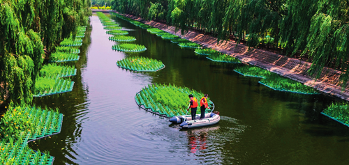 河北省雞澤縣在河道治理中采用“生態(tài)浮島”技術,種植挺水植物,既美化了河道,又凈化了水體,達到了生態(tài)治污效果(6 月 20 日攝)王曉攝