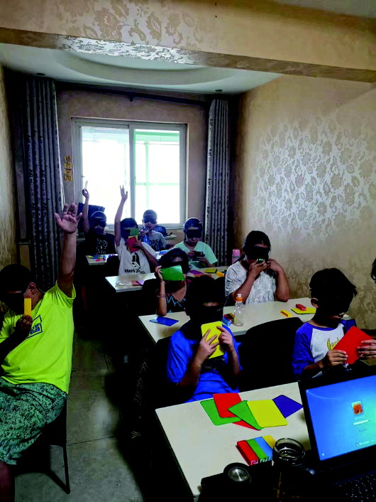 某培訓(xùn)機構(gòu)讓孩子蒙著眼睛感知顏色。 本報記者王菲菲攝