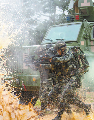 中隊官兵扛著彈藥箱在泥水中訓練沖刺。本報記者 金 歆攝