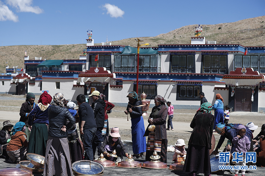白瑪?shù)膵寢尪松纤钟筒?,一邊喝著酥油茶,一邊和我聊起新房的事情。白瑪?shù)膵寢屨f(shuō),以前住在山頂上,房屋密集、布局混亂,排水系統(tǒng)落后。新村建成后,她們就搬了下來(lái),村里配套設(shè)施齊全,房子住起來(lái)也舒適。