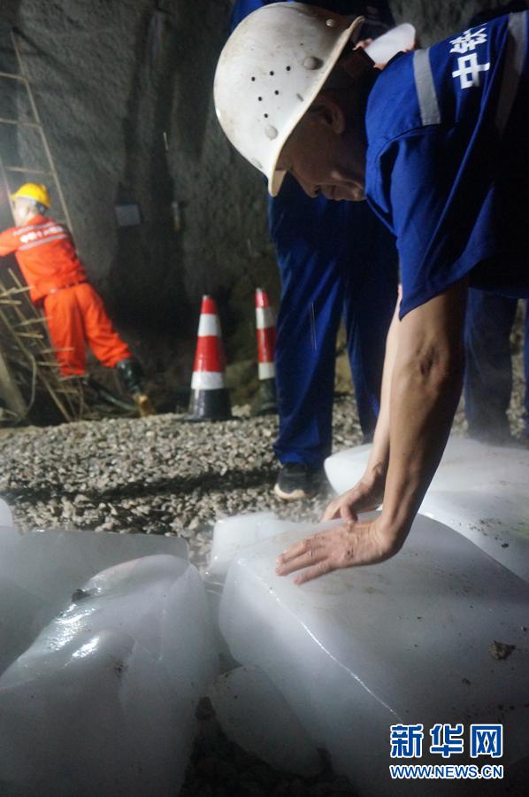 隧道內(nèi)的溫度高達40攝氏度,結(jié)束作業(yè)的工人在用冰塊降溫。新華網(wǎng)記者劉瓊 攝