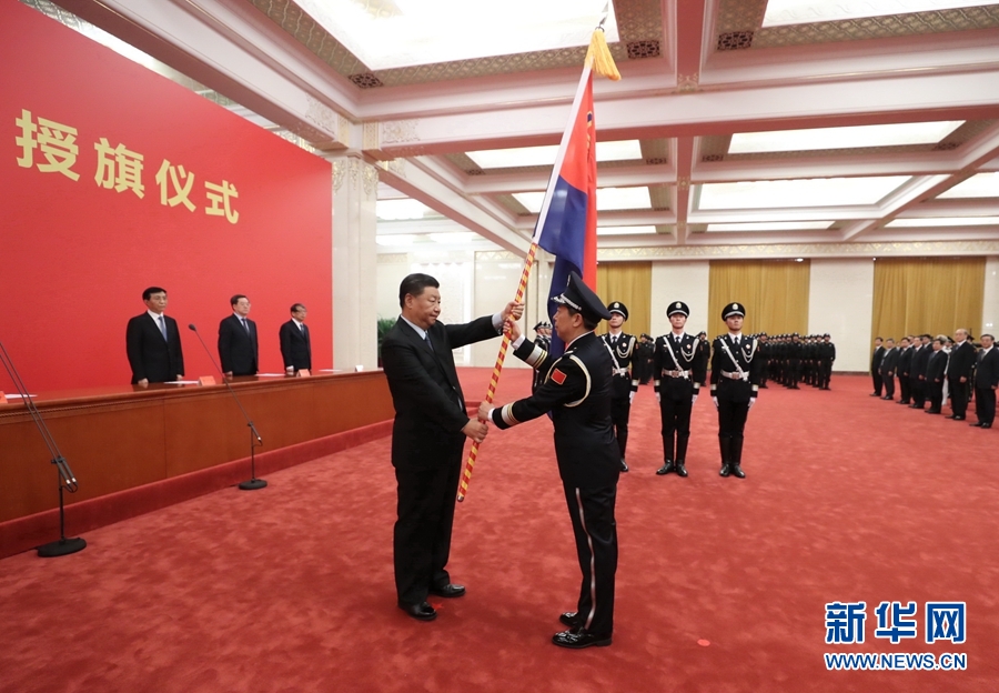 8月26日,中國(guó)人民警察警旗授旗儀式在人民大會(huì)堂舉行。中共中央總書(shū)記、國(guó)家主席、中央軍委主席習(xí)近平向中國(guó)人民警察隊(duì)伍授旗并致訓(xùn)詞。這是習(xí)近平向中國(guó)人民警察隊(duì)伍授旗。 新華社記者 鞠鵬 攝