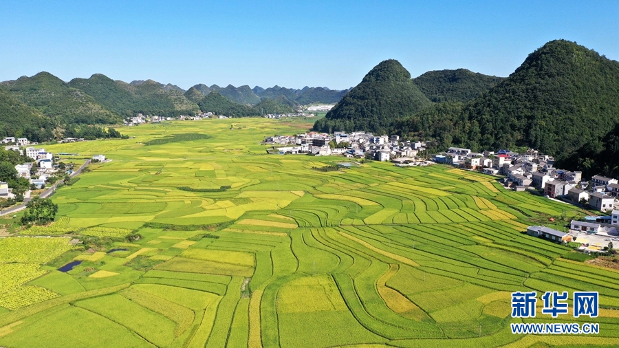 8月26日拍攝的貴州省安龍縣招堤街道海莊村的稻田景色(無(wú)人機(jī)照片)。 時(shí)下,浙江、湖南、貴州等地水稻陸續(xù)進(jìn)入成熟期,豐收在望。 新華社發(fā)(劉朝富 攝)