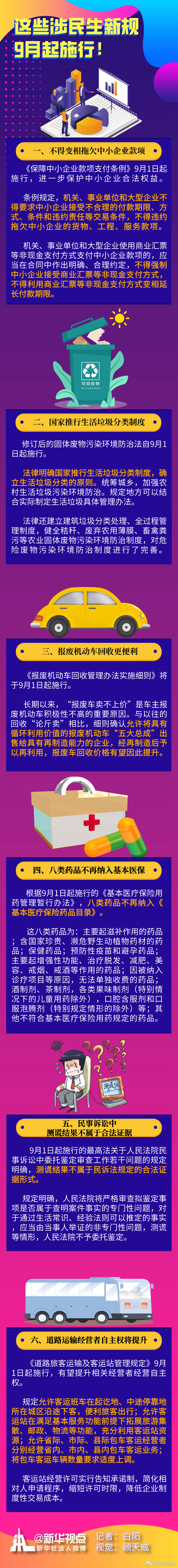 不得變相拖欠中小企業(yè)款項(xiàng)、國(guó)家推行生活垃圾分類制度、報(bào)廢機(jī)動(dòng)車回收更加便利……即將到來的9月,又一批民生新規(guī)開始施行,給你我?guī)韺?shí)惠。