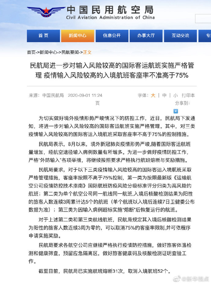 截至目前,民航局已實施航班熔斷31次,取消入境航班52個。