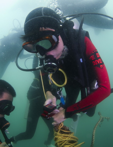 方堅(jiān)澤扭動(dòng)著身體滑進(jìn)海里。等到教練在水中幫他安上40斤重的氣瓶,他慢慢地潛入海底。