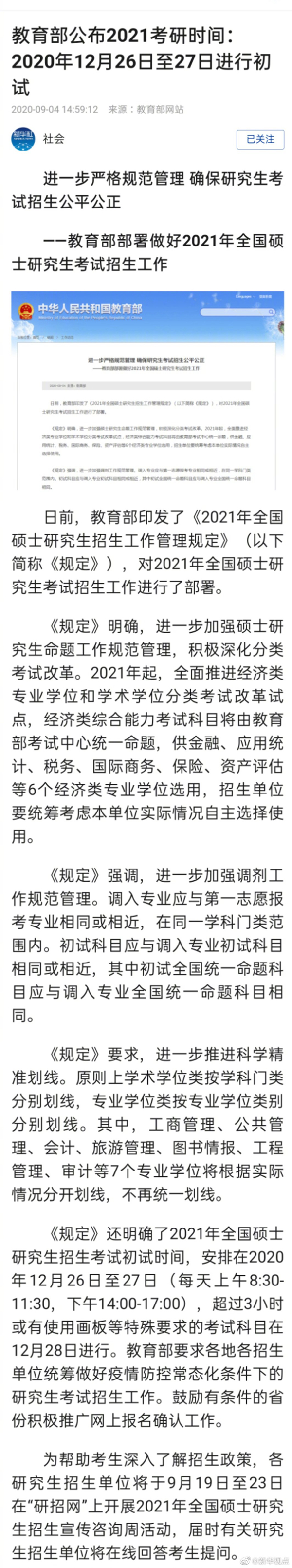 其中,明確了2021年全國(guó)碩士研究生招生考試初試時(shí)間,安排在2020年12月26日至27日(每天上午8:30-11:30,下午14:00-17:00),超過3小時(shí)或有使用畫板等特殊要求的考試科目在12月28日進(jìn)行。教育部要求各地各招生單位統(tǒng)籌做好疫情防控常態(tài)化條件下的研究生考試招生工作。鼓勵(lì)有條件的省份積極推廣網(wǎng)上報(bào)名確認(rèn)工作。