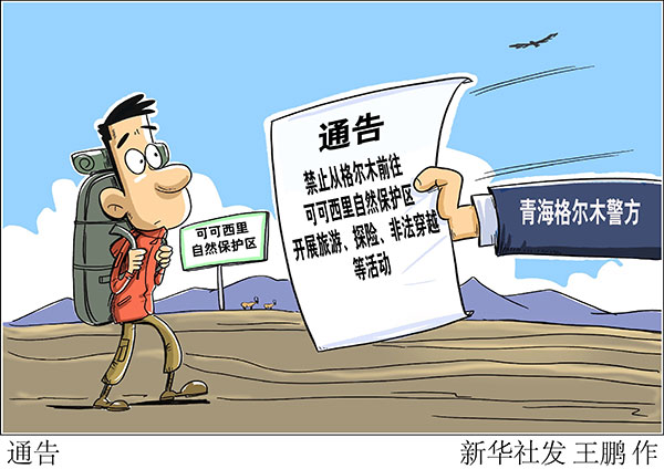 為加強可可西里自然保護區(qū)的管理和保護,保障廣大人民群眾和游客人身安全,維護社會治安秩序,格爾木市公安局根據(jù)有關(guān)法律法規(guī)和文件精神發(fā)布通告,禁止一切社會團體或個人隨意從格爾木前往玉樹藏族自治州可可西里自然保護區(qū),開展旅游、探險、非法穿越等活動。