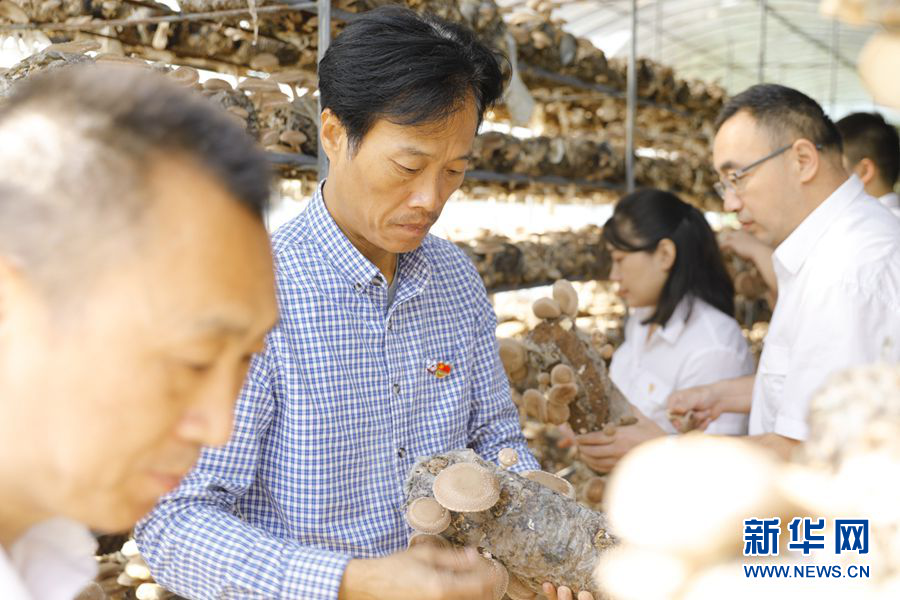??? 在第一書(shū)記郭旗(左二)的動(dòng)員下,2019年9月,中國(guó)鐵路西安局集團(tuán)有限公司西安供電段黨員、干部到唐灣村幫助村民采摘豐收的香菇。新華網(wǎng)發(fā)(西安供電段駐唐灣村扶貧工作隊(duì)供圖)