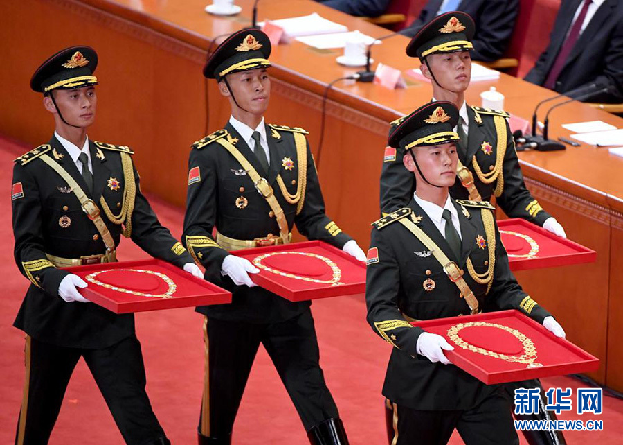6名號(hào)手吹響儀式號(hào)角,4名禮兵手捧共和國(guó)勛章、國(guó)家榮譽(yù)稱號(hào)獎(jiǎng)?wù)抡阶呱现飨_(tái),鏗鏘的步伐在人民大會(huì)堂大禮堂內(nèi)久久回蕩。中華人民共和國(guó)國(guó)家勛章和國(guó)家榮譽(yù)稱號(hào)頒授儀式開始了。