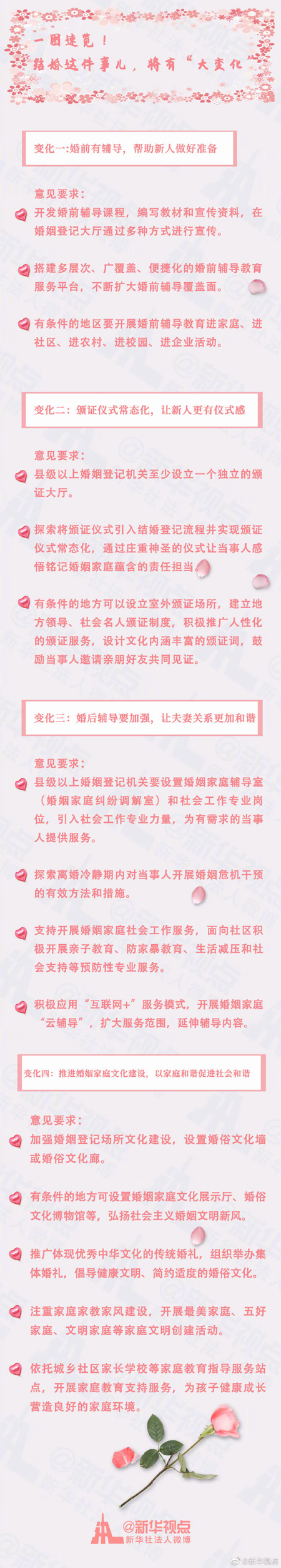 婚姻是家庭的紐帶,婚姻家庭和諧事關(guān)民生幸福和社會穩(wěn)定。意見要求,要探索開展婚前輔導(dǎo),開發(fā)婚前輔導(dǎo)課程,編寫教材和宣傳資料,在婚姻登記大廳通過宣傳欄、視頻、免費贈閱等方式進行宣傳,幫助當事人做好進入婚姻狀態(tài)的準備,學(xué)會管理婚姻,努力從源頭上減少婚姻家庭糾紛的產(chǎn)生。