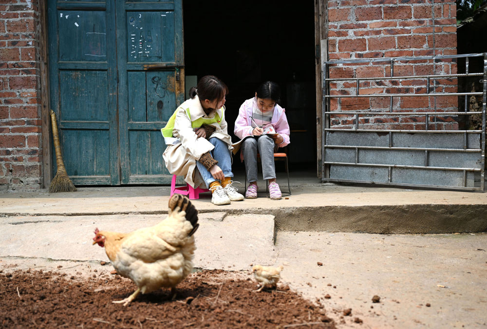 ↑重慶鐵路小學(xué)支教老師穆翼(左)和蓮花小學(xué)老師陶瑤一同打掃校園