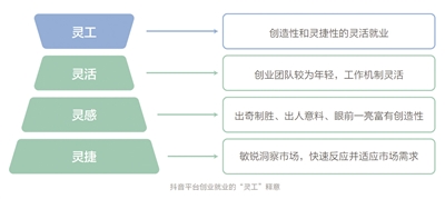 抖音就業(yè)人員規(guī)模龐大、類型多樣、形態(tài)各異?!秷蟾妗氛J為,其就業(yè)特色可以用“靈工”來概括,即具有靈活、靈氣和靈捷的特征,更強調多元化和創(chuàng)造力,不同于共享經濟平臺和傳統(tǒng)“零工”就業(yè)特征。
