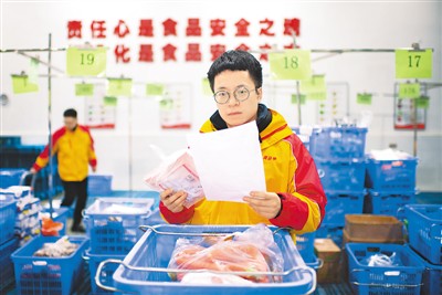 陜西黃馬甲物流配送股份有限公司生鮮中央工廠的工作人員認(rèn)真核對供應(yīng)鏈產(chǎn)品。馬 壯攝