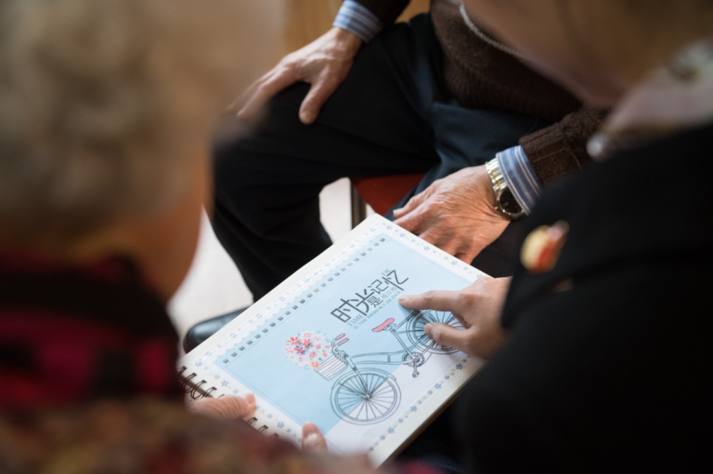 1月17日,杭州市社會福利中心“90后”朋友張丹俠(右)給83歲的王育華(左)送來她剛剛做好的相冊(翁忻旸/ 攝)