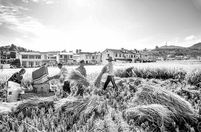 湖北省竹溪縣中峰鎮(zhèn)狄裕溝村農(nóng)民在金色貢米田園收割先成熟的稻谷。溫大樹(shù)攝/光明圖片
