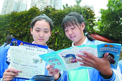 9月15日,四川省內(nèi)江市東興初級(jí)中學(xué)學(xué)生正在閱讀網(wǎng)絡(luò)安全宣傳資料。蘭自濤攝/光明圖片