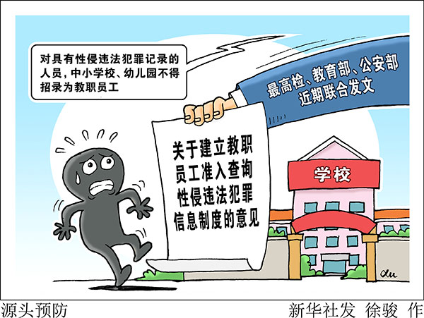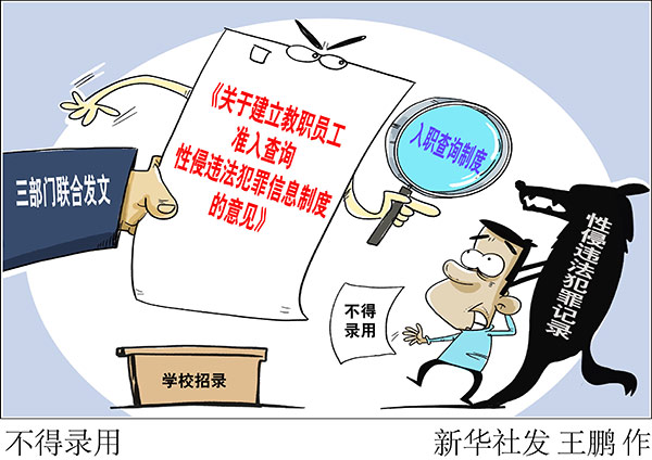 新華社北京9月18日電(記者陳菲)為加強(qiáng)對(duì)性侵未成年人犯罪的源頭預(yù)防,最高檢、教育部、公安部近期聯(lián)合發(fā)文,要求在全國(guó)建立入職查詢制度,對(duì)具有性侵違法犯罪記錄的人員,中小學(xué)校、幼兒園不得錄用,教師認(rèn)定機(jī)構(gòu)不得認(rèn)定教師資格。