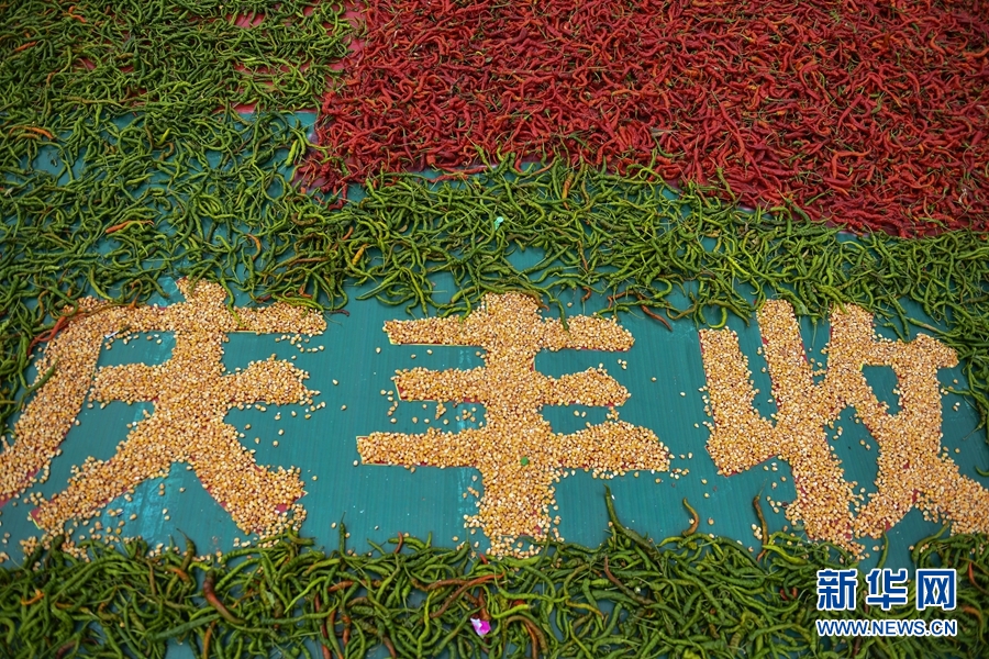 2020年慶祝中國農(nóng)民豐收節(jié)暨循化縣消費(fèi)扶貧“辣椒節(jié)”上由線辣椒和玉米拼成的慶豐收圖案。(新華網(wǎng)潘彬彬攝)