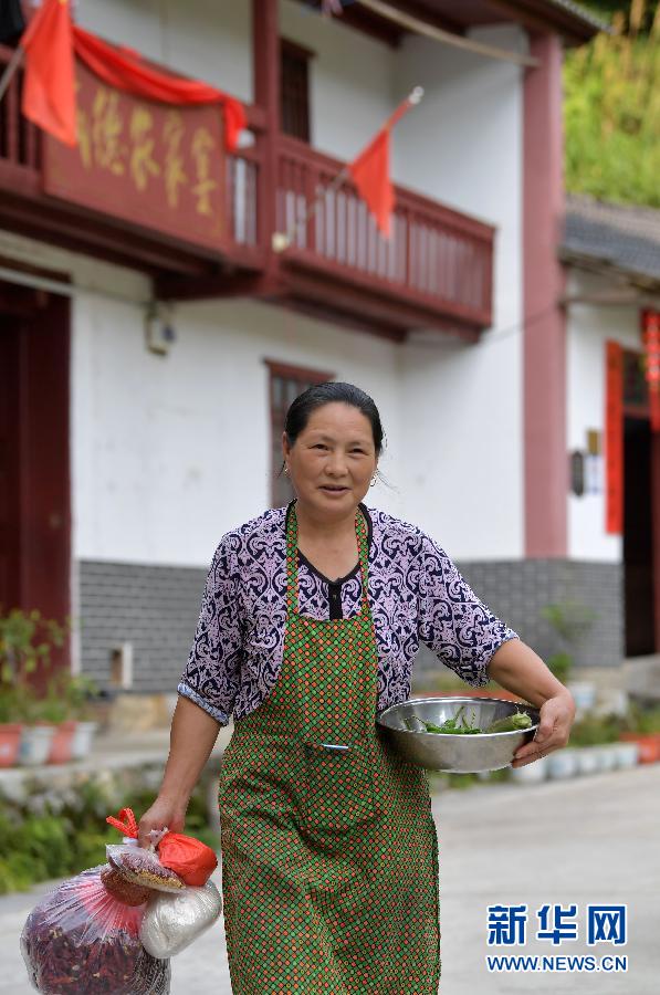 神山村村民彭夏英在自己開的農(nóng)家樂前展示自家的農(nóng)產(chǎn)品(7月15日攝)。新華社記者 彭昭之 攝