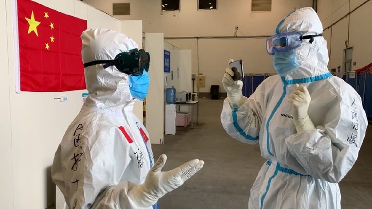 3月7日,武漢首批最大規(guī)模方艙醫(yī)院東西湖方艙醫(yī)院休艙現(xiàn)場,人民日報記者吳姍(右)見證最后一批轉(zhuǎn)院患者出艙。