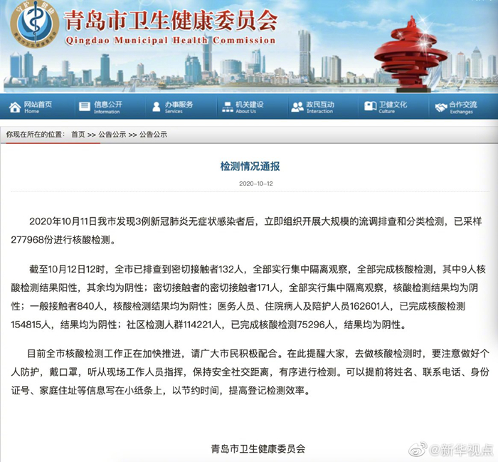 青島市衛(wèi)生健康委員會(huì)發(fā)布檢測情況通報(bào)稱,2020年10月11日我市發(fā)現(xiàn)3例新冠肺炎無癥狀感染者后,立即組織開展大規(guī)模的流調(diào)排查和分類檢測,已采樣277968份進(jìn)行核酸檢測。