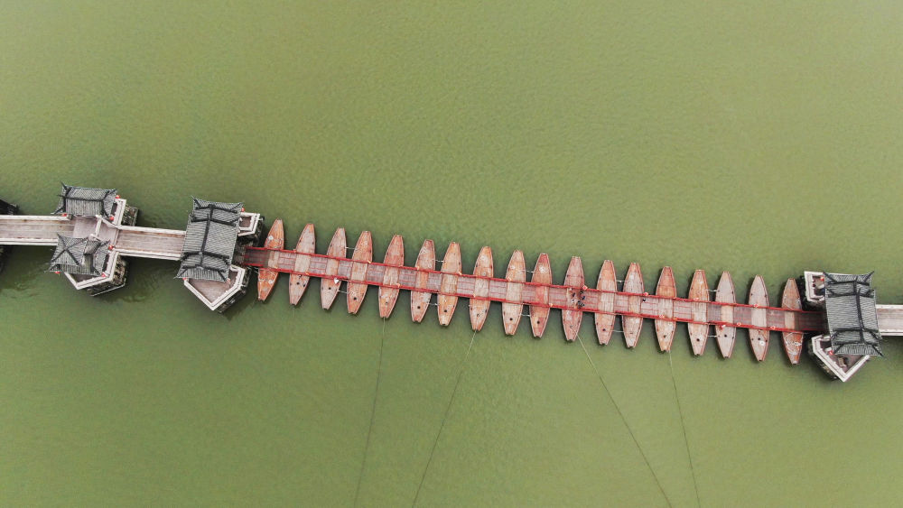 ↑ 廣濟(jì)橋中間的浮橋由十八只木船連接而成