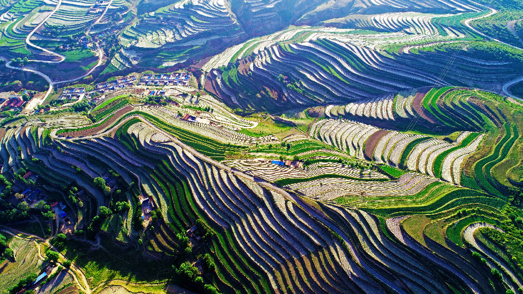 2019年6月9號(hào)拍攝于寧夏西吉縣偏城鄉(xiāng)上馬村。早上的太陽(yáng)剛剛升起,照在薄膜地上猶如一道道發(fā)光的銀線,旱作梯田經(jīng)過(guò)改良,壯觀而又美麗。(蔡全錄攝)