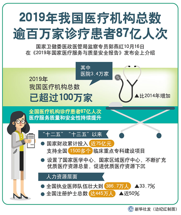 新華社北京10月16日電(記者呂諾、王琳琳)國家衛(wèi)健委醫(yī)政醫(yī)管局監(jiān)察專員郭燕紅16日在《2019年國家醫(yī)療服務與質量安全報告》發(fā)布會上介紹,2019年,我國醫(yī)療機構總數(shù)已超過100萬家,其中醫(yī)院3.4萬家。全國醫(yī)療機構診療患者87億人次,醫(yī)療服務質量和安全性持續(xù)提升。