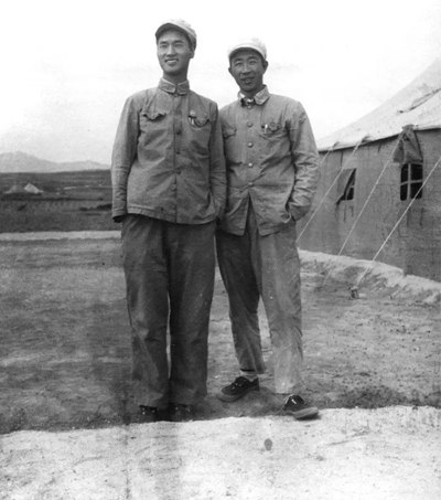 1951年夏新華社記者閻吾(右)、李耐因在開(kāi)城停戰(zhàn)談判會(huì)場(chǎng)帳篷外留影。