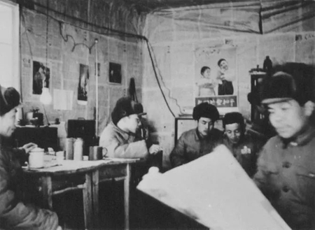 朝鮮戰(zhàn)場(chǎng)的環(huán)境十分艱苦,志愿軍總分社的編輯部常年設(shè)在陰暗潮濕的山洞里,駐地附近幾次遭到敵機(jī)轟炸、掃射。圖為總分社何友、李健華、孫大文等同志在山洞內(nèi)學(xué)習(xí)。