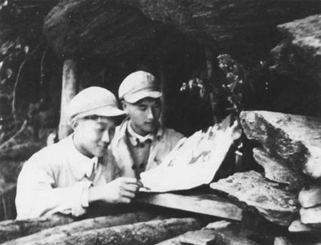 1951年抗美援朝第5次戰(zhàn)役期間,新華社記者李耐因隨軍(26軍)采訪,經(jīng)常露營(yíng),寫(xiě)稿子也常是在樹(shù)下、路邊或臨時(shí)搭起的棚子里。這是記者李耐因(右)在臨時(shí)搭起的防空棚下,向軍隊(duì)參謀人員請(qǐng)教戰(zhàn)況。