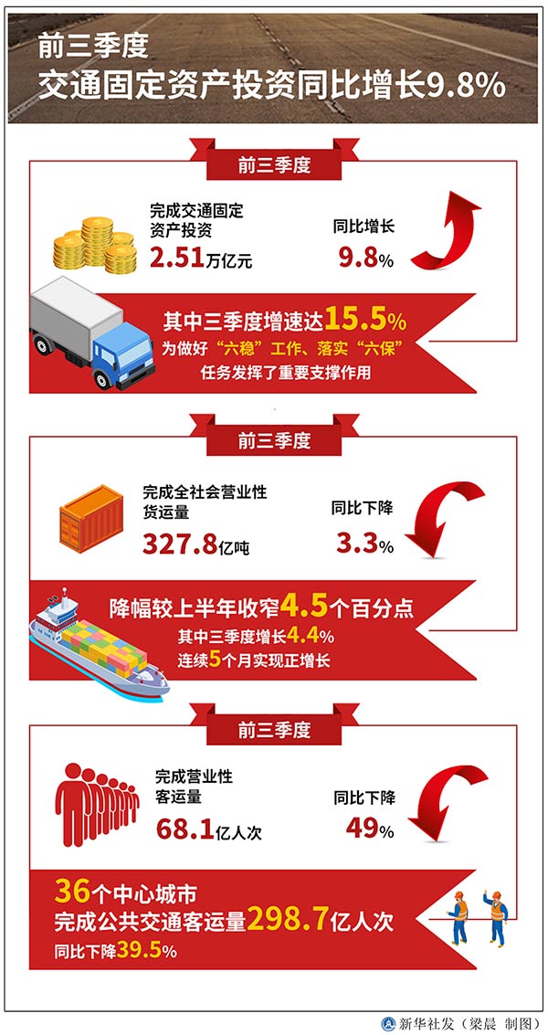 新華社北京10月28日電(記者魏玉坤)交通運輸部新聞發(fā)言人、政策研究室主任吳春耕28日在國新辦發(fā)布會上表示,前三季度,完成交通固定資產(chǎn)投資2.51萬億元,同比增長9.8%,其中三季度增速達15.5%,為做好“六穩(wěn)”工作、落實“六?!比蝿瞻l(fā)揮了重要支撐作用。