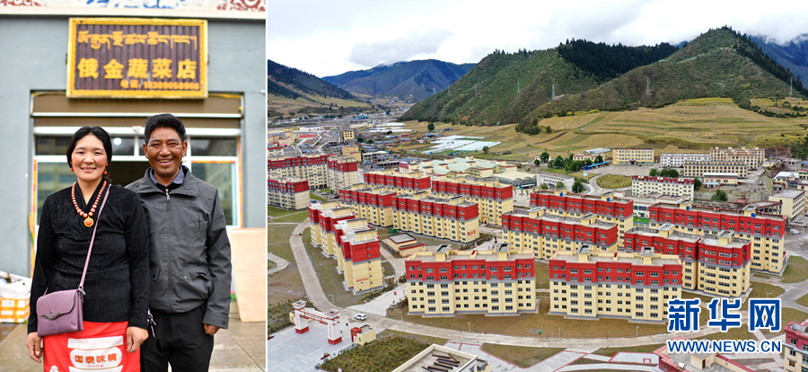 2020年9月22日拍攝的拼版照片:左圖為西藏自治區(qū)昌都市類烏齊縣長毛嶺鄉(xiāng)達(dá)雄村村民俄金(右)和妻子阿丁在安置點(diǎn)俄金蔬菜店前;右圖為類烏齊縣桑多扶貧開發(fā)區(qū)易地扶貧搬遷安置點(diǎn)一角(無人機(jī)照片)。 新華社記者 詹彥 攝