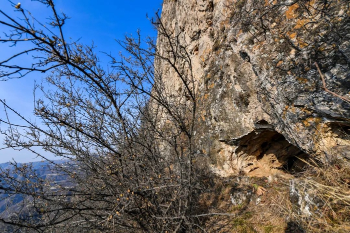 這次3個(gè)老鄉(xiāng)帶路,換路而行。路程明顯縮短,但卻十分陡峭。有的石階僅容一只腳,兩只手也只能扒著峭壁,而身后就是懸崖。攀爬一個(gè)多小時(shí)后,一個(gè)山洞映入眼簾。
