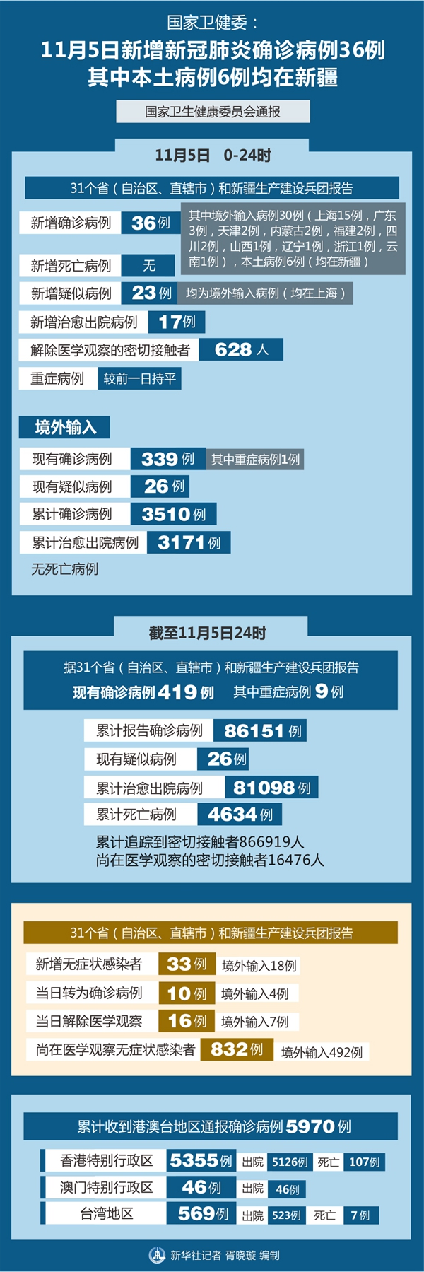 截至11月5日24時,據(jù)31個?。ㄗ灾螀^(qū)、直轄市)和新疆生產(chǎn)建設(shè)兵團報告,現(xiàn)有確診病例419例(其中重癥病例9例),累計治愈出院病例81098例,累計死亡病例4634例,累計報告確診病例86151例,現(xiàn)有疑似病例26例。累計追蹤到密切接觸者866919人,尚在醫(yī)學(xué)觀察的密切接觸者16476人。
