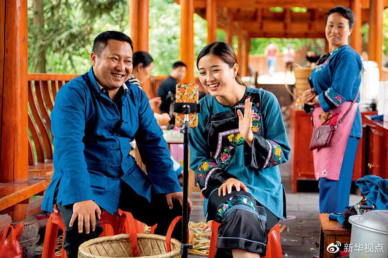 5月15日,十八洞村第三任扶貧工作隊(duì)隊(duì)長(zhǎng)麻輝煌(左)與返鄉(xiāng)大學(xué)生施林嬌一起通過(guò)網(wǎng)絡(luò)直播推銷土特產(chǎn) 新華社記者陳思汗 攝