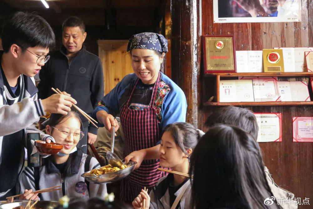 10月26日,十八洞村村民施進(jìn)蘭的妻子龍齊英(中)在農(nóng)家樂(lè)給游客們上菜(受訪者供圖) 新華社發(fā)